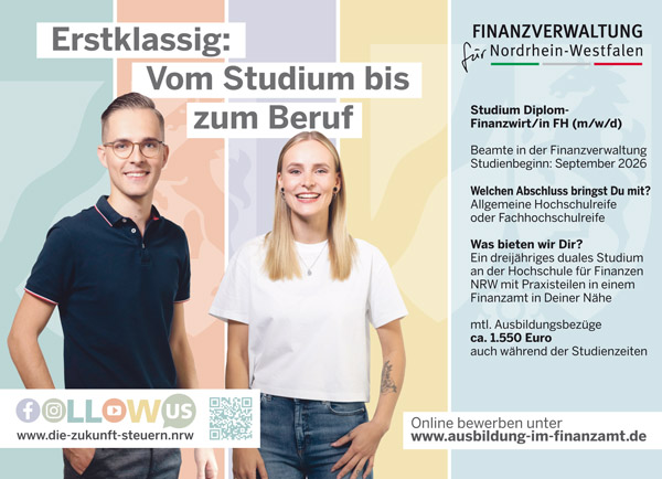 Da wir gerade bei historischen Gebäuden sind: Die Finanzverwaltung des Landes Nordrhein-Westfalen hat da ebenfalls etwas zu bieten. Sie unterhält auch eine eigene Unterrichtsstätte, die Hochschule für Finanzen (HSF), die in einem Schloss residiert, sogar in einem Wasserschloss. Es befindet sich in Nordkirchen, das zwischen Dortmund und Münster liegt. Hier wird man in drei Jahren zur Diplom-Finanzwirtin oder zum Diplom-Finanzwirt ausgebildet. Wie schon bei den vorigen Ausbildungsmöglichkeiten handelt es sich um ein duales Studium, da man zugleich eine praktische Ausbildung in einem Finanzamt in der Nähe seines Wohnorts durchläuft. Auch hier verdient man bereits während des Studiums Geld, in diesem Fall sind es rund 1.550 Euro im Monat. Danach wird man ins Beamtenverhältnis auf Probe übernommen.